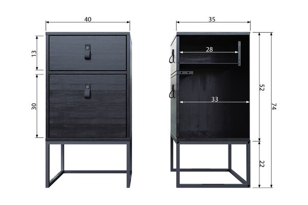 Der schwarze Nachttisch Zola mit Schublade und tiefschwarzer Tür ist ein modernes Möbelstück aus Metall und Kiefernholz aus der Kollektion WOOOD, das in jedes Schlafzimmer passt. Das Metall und das Holz sind schwarz gefärbt. Der Nachttisch ist 74 cm hoch, 40 cm breit und 35 cm tief und hat einen 22 cm hohen Rahmen. Der Nachttisch wird als Bausatz geliefert und lässt sich mithilfe der mitgelieferten Montageanleitung leicht aufbauen.