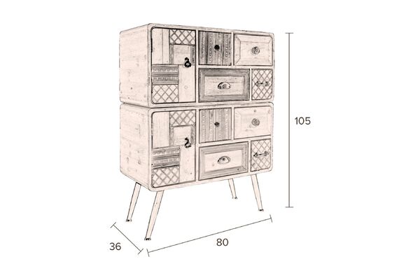Mit ihren zwei Türen und acht Schubladen, die mit einem Mosaik aus massivem Tannenholz verziert sind, vermittelt diese Kommode ihr ursprüngliches Aussehen. Jedes Detail ist sorgfältig gemeißelt, bis hin zu den herrlich unterschiedlichen Handgriffen und Knöpfen, die für ein gealtertes Aussehen angebracht wurden.