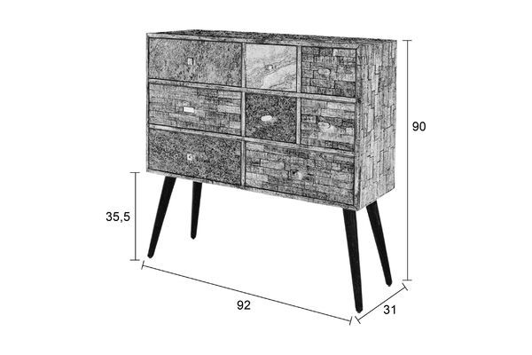 Das Ganze steht auf konisch zulaufenden schwarzen Stahlbeinen und bietet somit ein sehr schönes Design. Es ist eine Kommode mit einer Gesamthöhe von 89 cm, die man sich nicht entgehen lassen sollte!
