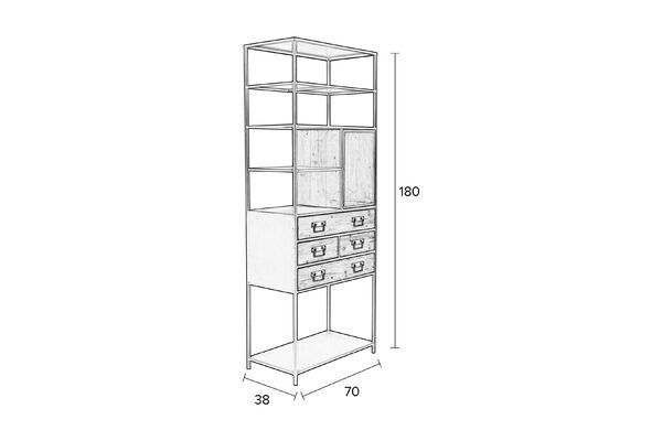 Audacieux mélange de styles, l'étagère Samuel oscille entre l'authenticité du bois et le look moderne et industriel du métal. Les deux s'associent à merveille avec des poignées en fer sur les tiroirs dont la façade revêt la teinte naturelle du sapin. De même, les étagères métalliques disposent d'un compartiment en bois. Ces deux matériaux s'unissent parfaitement sur ce meuble très élégant.