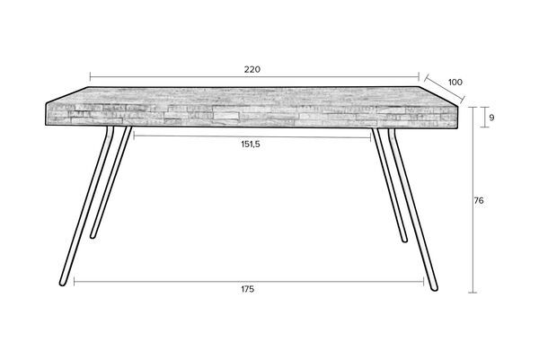 Un bel look vintage, questo è ciò che il tavolo Suri vi offre grazie al suo spesso piano in teak riciclato che contrasta con la sua sottile struttura in acciaio nero in stile industriale. Senza dubbio darà un forte cachet al vostro interno. Il piano è composto da diverse vecchie tavole di teak, tutte diverse tra loro, che conferiscono a ciascuna di esse un carattere unico. Non ci sono due tavoli Suri identici!