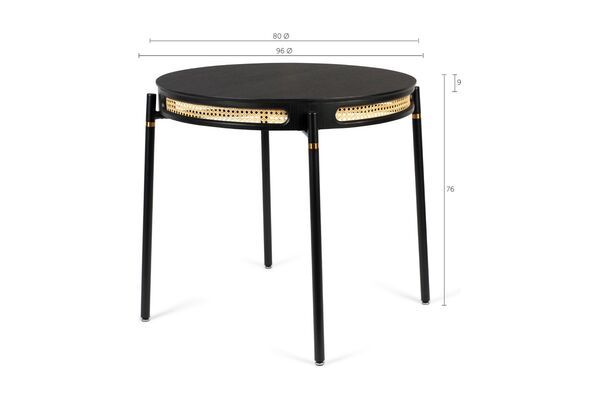 La mesa redonda Webbing de madera negra y ratán, de 96 cm de diámetro, es perfecta para espacios íntimos. Su diseño, que incorpora con elegancia el ratán, aporta un toque de calidez y estilo a las cenas para dos, creando un ambiente acogedor y refinado.