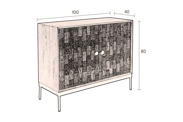 Si vous appréciez l'art et aimez le style contemporain, ce buffet est fait pour vous ! Ce joli buffet fait 40cm sur 100cm avec une hauteur de 80cm. Le meuble est en bois de manguier ce qui lui donne un look très naturel. Le cadre et les pieds sont en fer laqué en noir. Le devant est formé de deux petites portes en bois sculptées dans un style marquèterie du plus bel effet, et joue sur les différentes teintes du bois. Un buffet naturel très design qui s'intègrera à merveille dans votre salon.