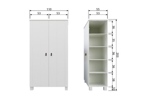 The Ties wardrobe is a Dutch product from the WOOOD brand. This FSC certified solid pine cabinet has a brushed finish and the doors have 2 vertical v-grooves. The interior of the cabinet is made of melamine and consists of a wide shelf at the top with a divided rod below on the left and three divided shelves on the right. The door is fitted with brown leather handles.