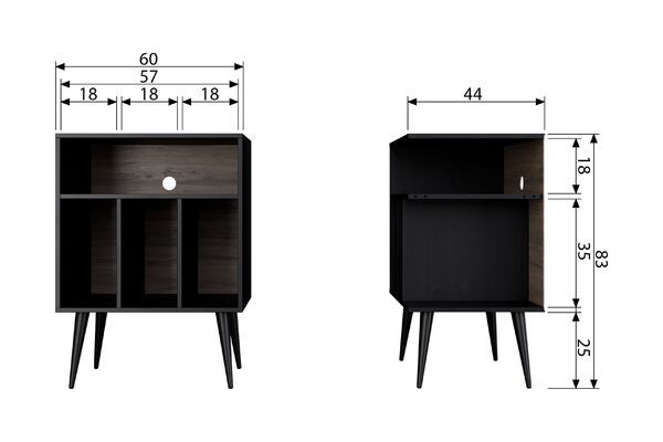 De zwarte houten kast uit de James serie van het merk WOOOD is deze zeer fraaie kast. Het meet H 83 x B 60 cm x D 44 cm en is gemaakt van mat zwart gelakt grenenhout. De kast is speciaal ontworpen voor het opbergen van platen in de drie onderste vakken met de afmetingen (H 35 x B 18 cm). Het bovenste grote vak is bedoeld voor de versterker, want aan de achterkant van de kast zit een gat waardoor u uw kabels kunt laten lopen. U kunt de kast natuurlijk ook voor andere doeleinden gebruiken! Het wordt geleverd als bouwpakket met duidelijke montage-instructies. Als u een harde vloer hebt, moet u viltglijders onder de zijplank plaatsen om beschadiging van de vloer te voorkomen.