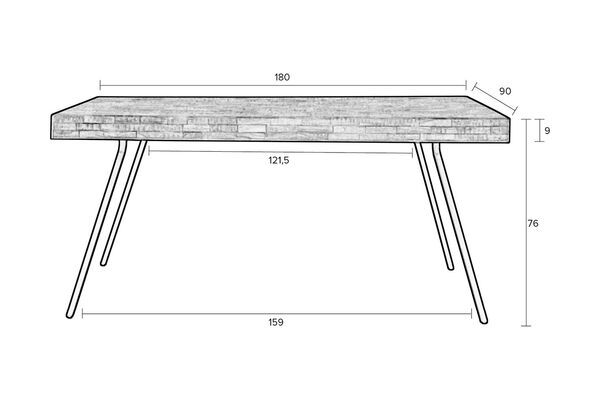 White Table Living heeft zich de Suri tafel met afmetingen van 180x90 cm voorgesteld, een stuk met een ultra-minimalistisch ontwerp dat bestaat uit een gerecycled teakhouten blad bedekt met een natuurlijke lak op waterbasis, geplaatst op vier zwarte stalen poten.