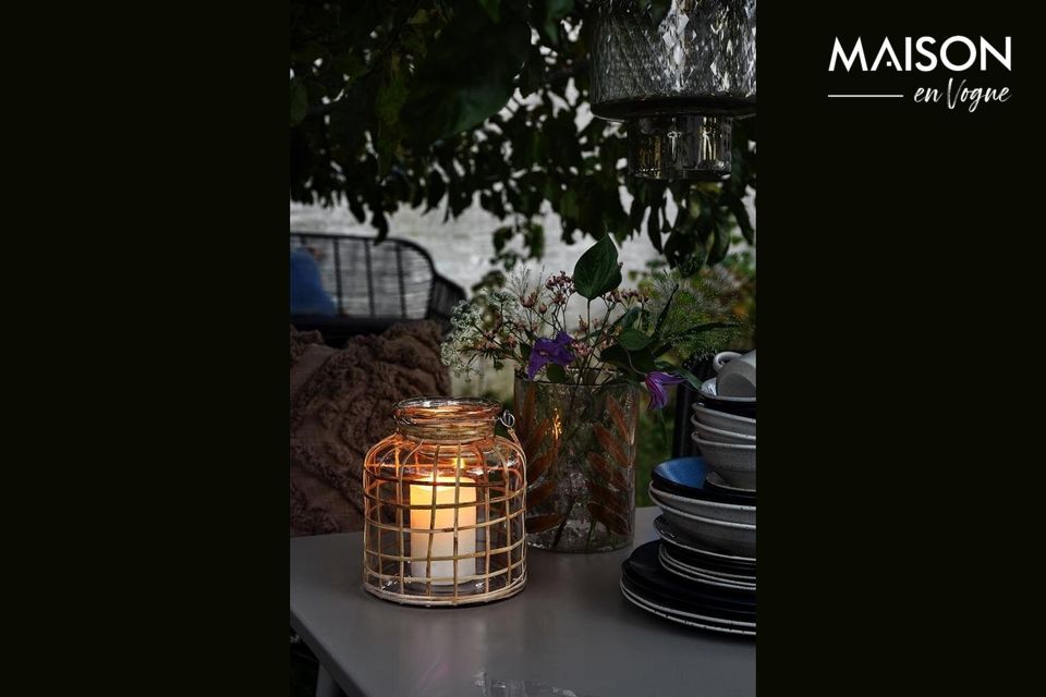 Conçue en bambou et équipée d'un insert en verre, la lanterne Bambou est un petit accessoire décoratif qui émet une lumière douce à travers ses motifs tressés. Cette charmante pièce au design naturel peut également être suspendue à l'aide de sa poignée tressée.