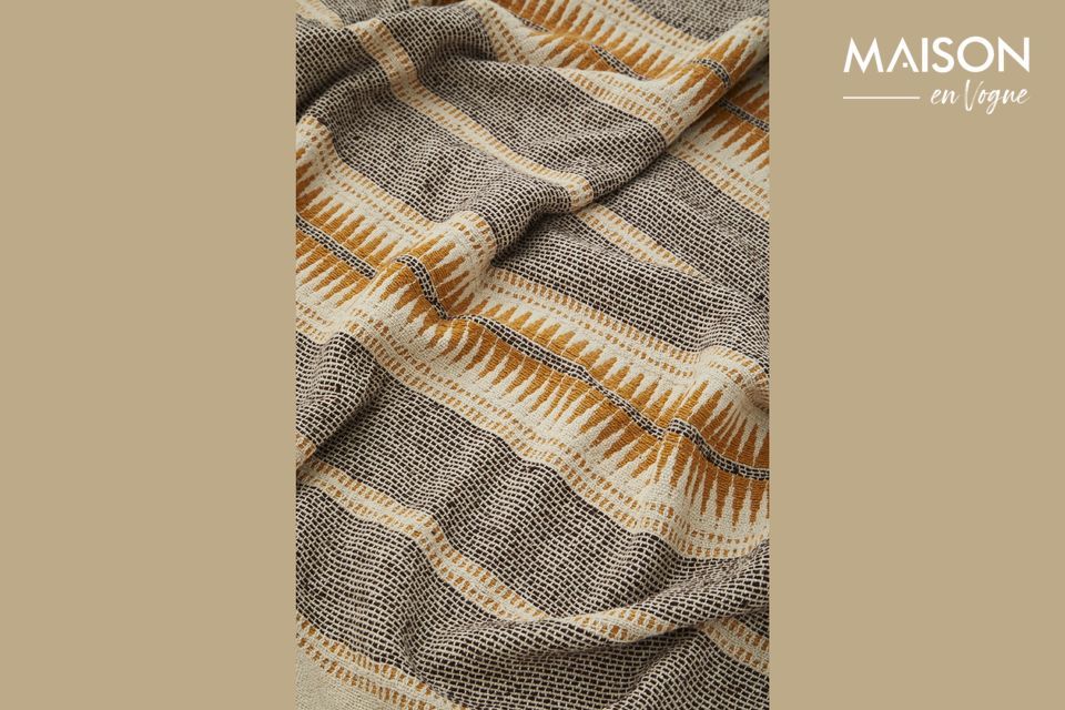 Optez pour une touche latino avec ce joli plaid en coton recyclé et autres fibres recyclées. Le plaid est écru avec des motifs variés tirant sur le marron et le miel. Sur sa largeur, on trouve des franges écrues. Il peut servir de décoration sur un lit ou un canapé. On pourra aussi apprécier sa douceur et sa chaleur lors d'une soirée plus fraîche, pour se couvrir. Dimensions 125x150 cm.