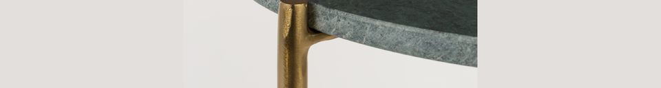 La table d'appoint Timpa marbre vert est un petit meuble raffiné avec son plateau en marbre naturel et sa structure en laiton. L'alliance de cette teinte dorée et du vert nervuré du marbre confère distinction et charme à cette table. Ses deux pieds croisés modernisent également son architecture. Cet accessoire séduit par son élégance et son style à la fois naturel et sophistiqué.