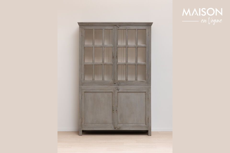 Le design graci eusement épuré de cette vitrine permet une intégration harmonieuse dans des décors variés, qu'ils soient traditionnels ou contemporains. La couleur grise, neutre mais élégante, ajoute une touche de raffinement subtil, tout en offrant une toile de fond idéale pour mettre en valeur vos objets de décoration, collections ou vaisselles. Avec ses proportions généreuses, elle offre un espace de stockage optimal tout en restant compacte et fonctionnelle.